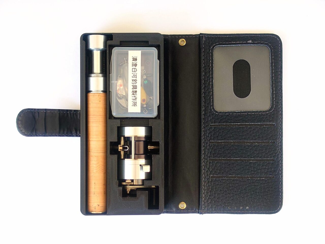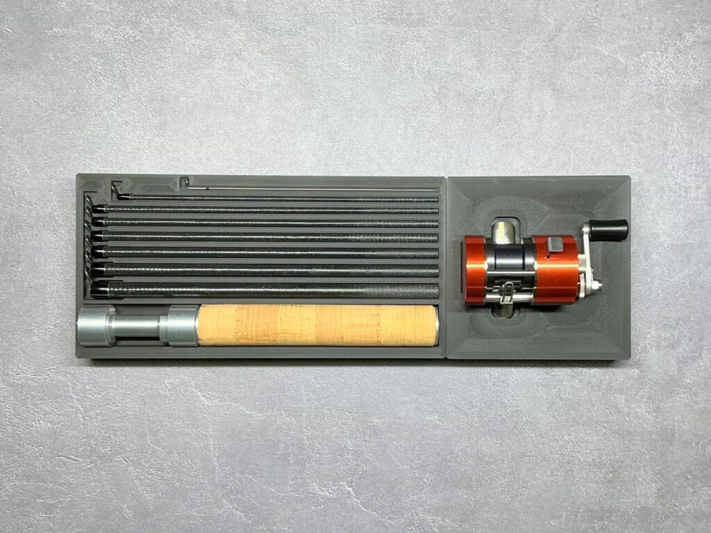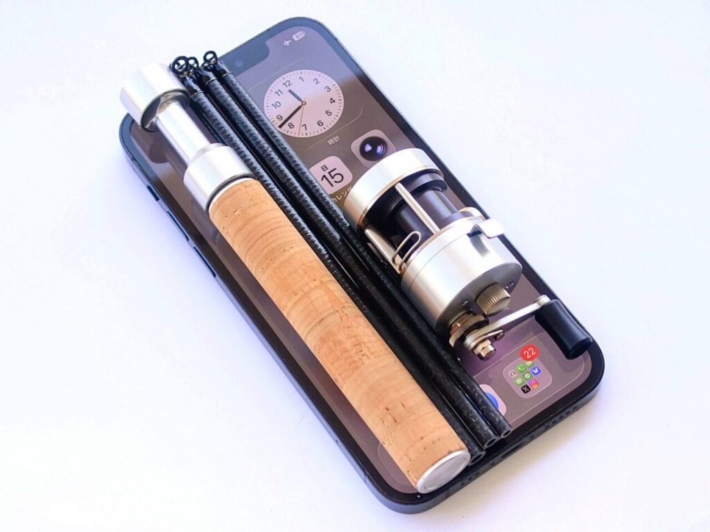 常時携帯可能な釣り道具をコンセプトとして、収納時の投影面積をスマートフォン(iPhone12)サイズに収めた超小型ルアータックルです。