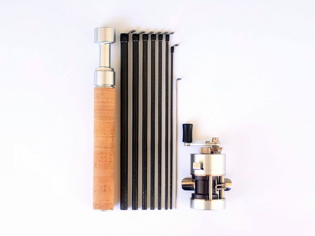 レベルワインダー/クラッチ/アンチリバース/ドラグ/マグネットブレーキを備えた世界最小のベイトキャスティングリールと、仕舞寸法約145mm(9本継、全長約1m)のロッドのセットです。